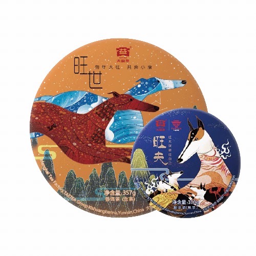 包裝上的兩隻神犬,一隻色深而性溫,象徵著普洱熟茶,一隻色淺而烈,象徵著普洱生茶,一生一熟,風味不同,各領乾坤。